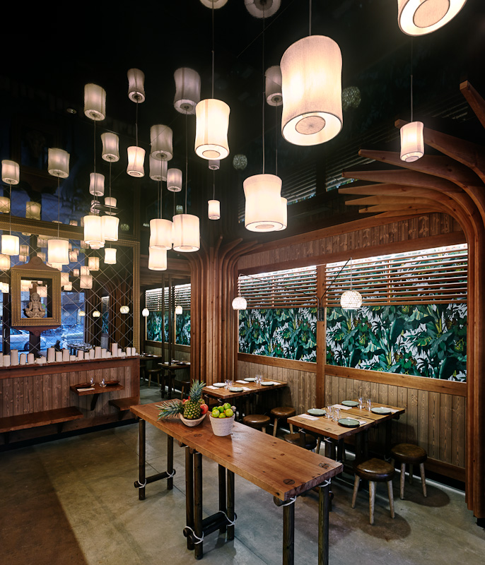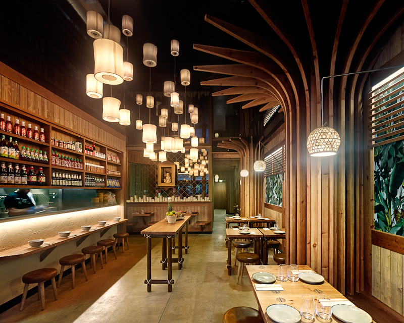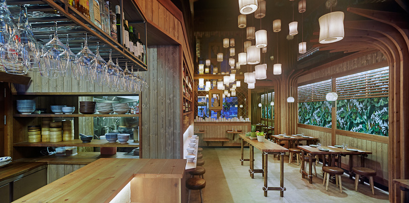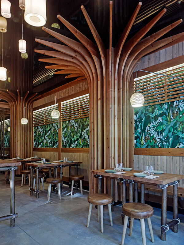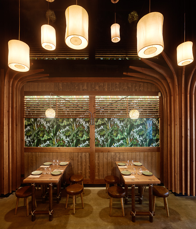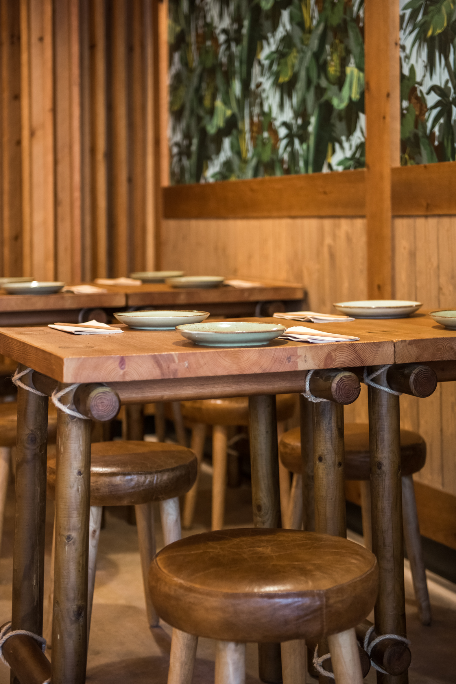 Estructura y sobre en madera de pino maciza, teñida color avellana, y acabada en barniz extra mate. Detalles en cuerda de fibras naturales.